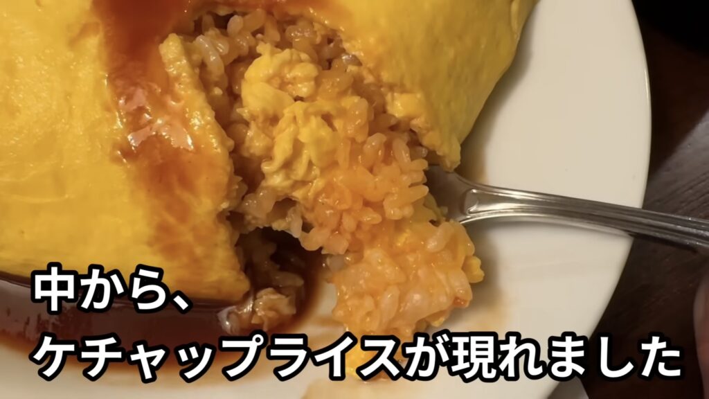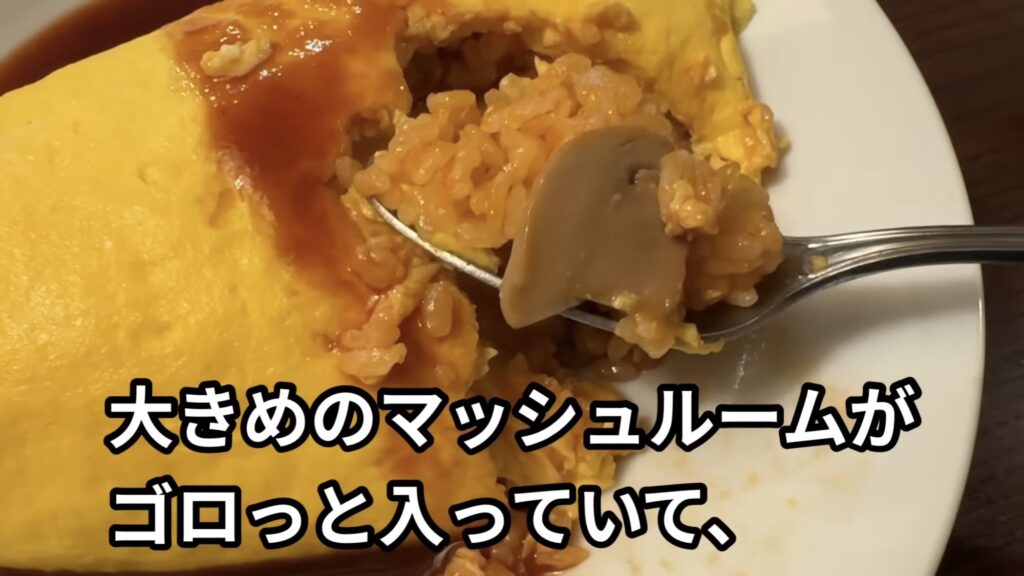 中のケチャップライスには、大きめのマッシュルームがゴロっと入っていて、食べ応えもしっかりあります。