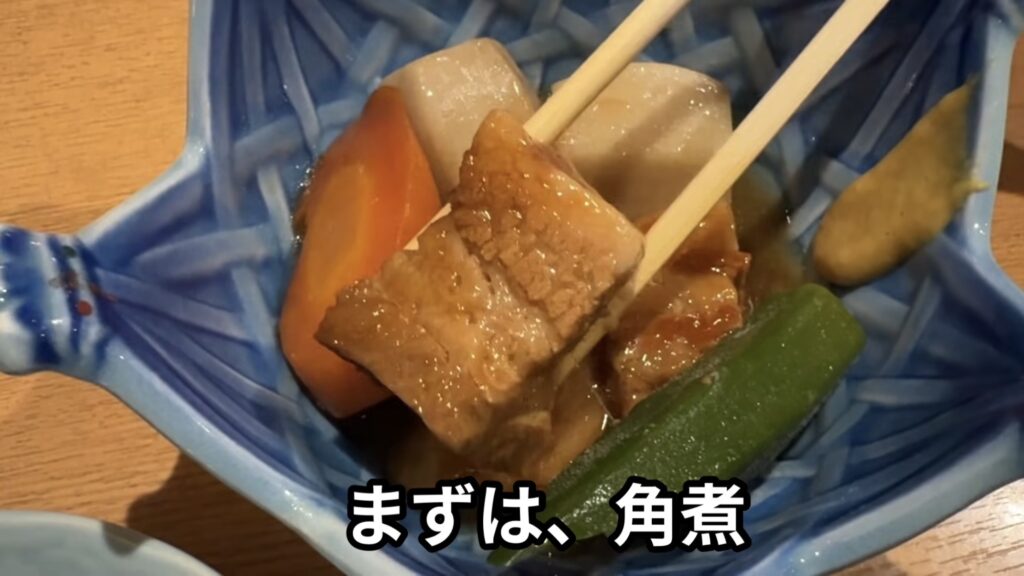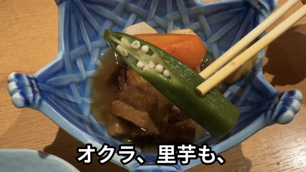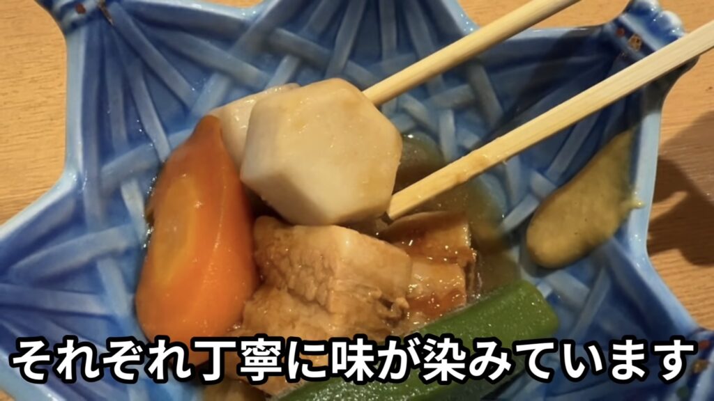 添えられたにんじん、オクラ、里芋にも味がしっかり染みていて、野菜の優しい甘みも楽しめます。