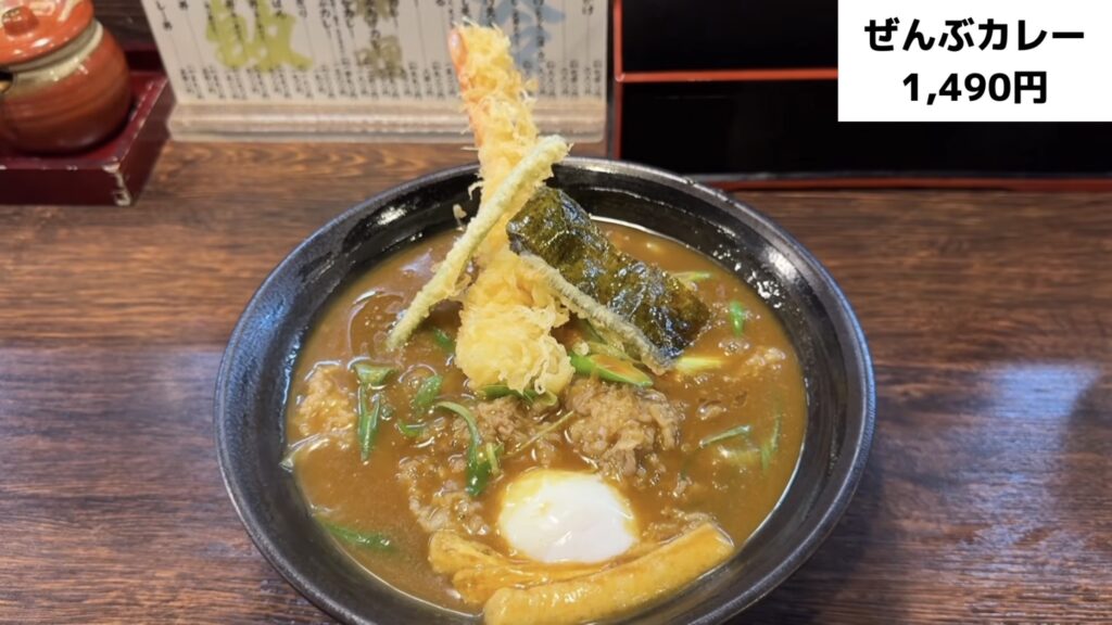 カレーうどんに天ぷら・肉増し・温玉・きざみあげが入った豪華な「全部入り」の一杯です。