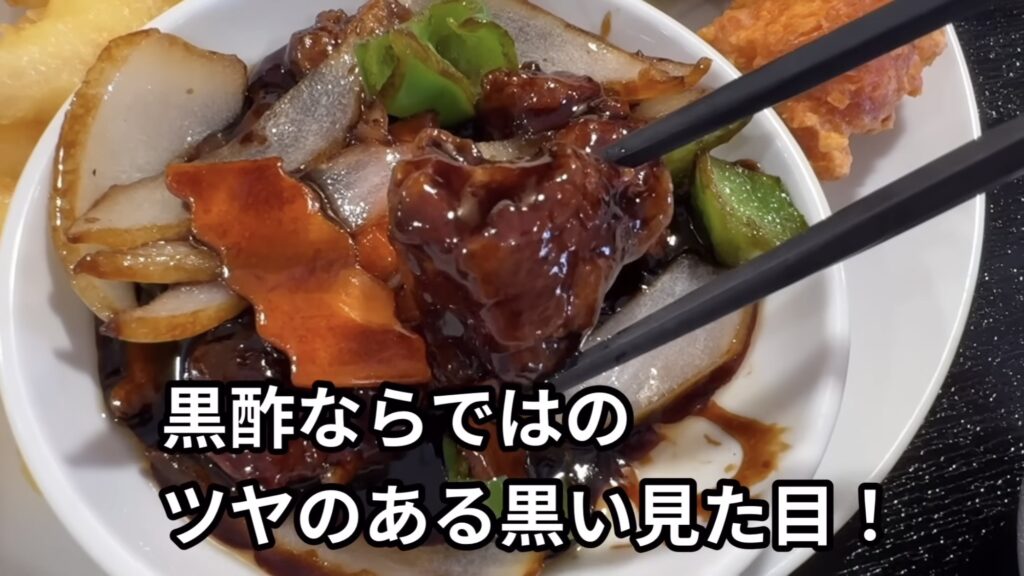 黒酢のタレがご飯にしっかり絡んで、間違いない美味しさ。