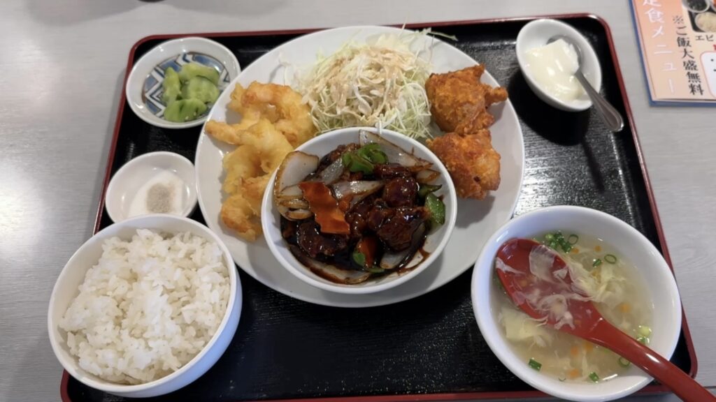✅ 黒酢酢豚・エビ天・唐揚げが一度に楽しめる贅沢プレート